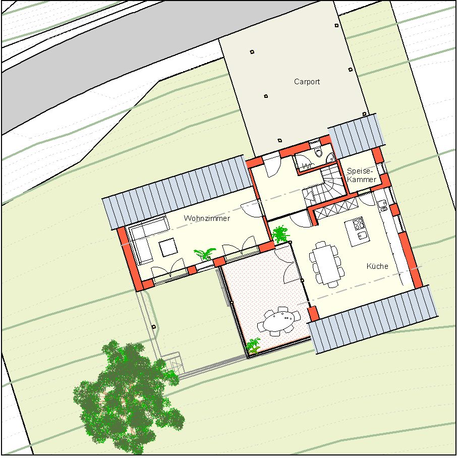 Durch die Winkelform des Hauses entsteht ein geschützter nach Süden geöffneter Bereich, eine Art Hof.