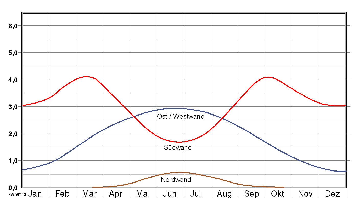 | Abb.1 : Energieeintrag auf Wänden nach Himmelsrichtungen | ||||||||||||||||