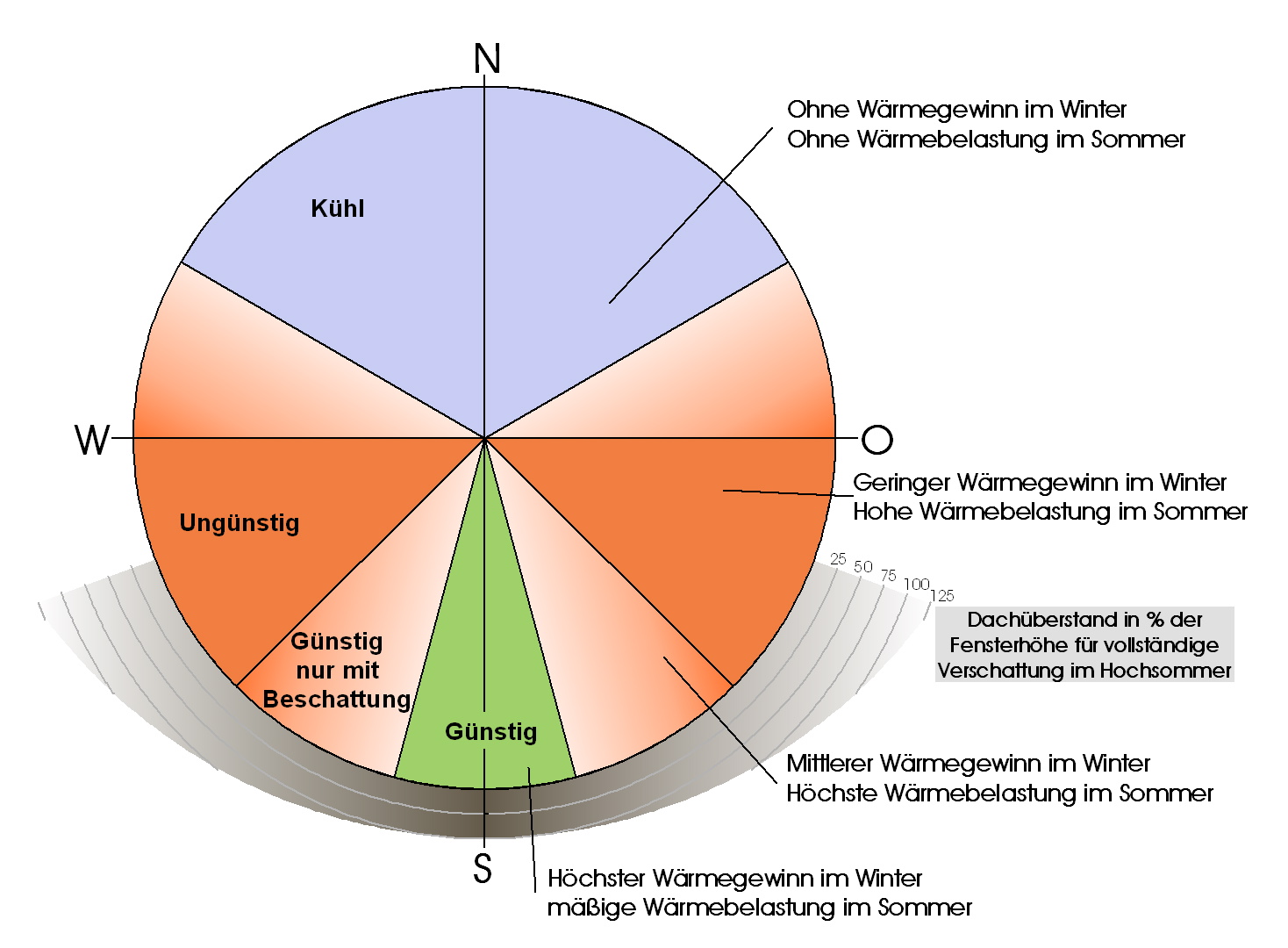 Leicht verständlich sind die Werte für Norden, die nur im Hochsommer geringe Energiegewinne zeigen, wie auch die Werte für Ost und West, die einen gleichmäßigen Anstieg von geringen Werten im Winter bis zu hohen Werten im Sommer zeigen. Auf den ersten Blick überraschend ist die Kurve für den Süden. Hier steigen die Werte bis Mitte März leicht an, fallen dann wieder und erreichen im Hochsommer den tiefsten Punkt. Grund dafür ist der steile Winkel (fast 70%) mit dem die Sommersonne auf die Südwand fällt. Verstärkt wird dieser Effekt bei Fenstern durch die Reflexion am Glas, die ab einem Einfallswinkel von 45° stark ansteigt. Aus dem sommerlichen Rückgang des Energieeintrags auf die Südwände erklärt sich die Bedeutung der Südfenster; die Energiegewinne im Winter führen hier nicht zwangsläufig zu einer Überhitzung im Sommer, wie das bei Ost- und Westfenstern der Fall ist. Kaum verbreitet ist wie wenig man von der Südrichtung abweichen kann, bevor dieser Effekt endet. Südwest ist nämlich die Himmelsrichtung mit dem größten Energieeintrag im Sommer. Die Folge : Nur fast genau nach Süden zeigende Fenster profitieren von der geringen Wärme-Belastung im Sommer. Eine Abweichung von nur 15° macht hier schon viel aus. |