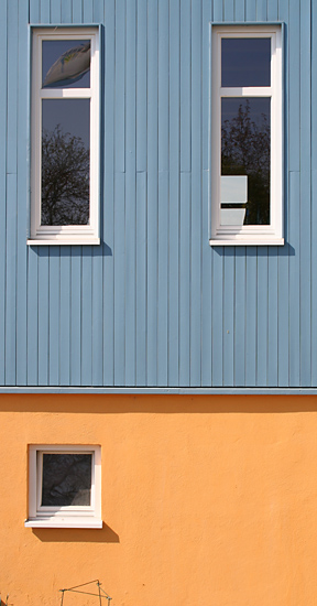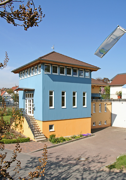| Veröffentlichungen & Wettbewerbe | Weinlabor Vogel, Geisenheim, Erbslöhstraße Baujahr 1999 Das Weinlabor Vogel in Geisenheim ist ein Anbau an einen bestehenden Weinkeller. Ein Holzrahmenbau mit sichtbaren Balkendecken und Dachstuhl ist auf ein massives Sockelgeschoss, das den Faßweinkeller des Weinguts enthält, aufgesetzt. Das Gebäude besteht aus zwei ineinander geschobenen Kuben. Der kleinere, turmartige ist mit blau lasiertem Lärchenholz verkleidet. |
